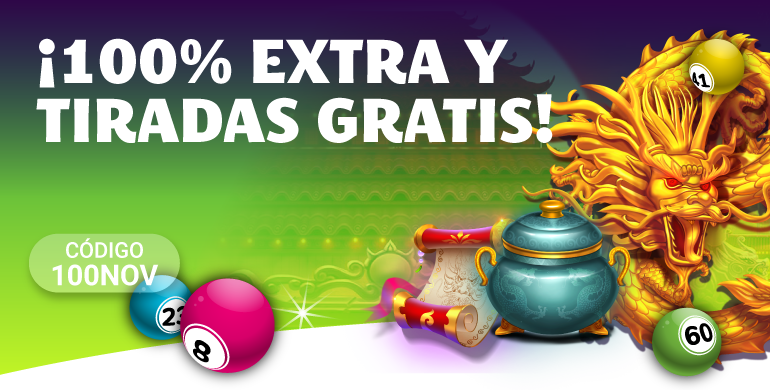 El usuario que realice un depósito de 10€ o más con el código 100NOV recibirá un 100% extra hasta 20€ de bono bingo y 15 tiradas gratis en la slot Dragon Hero.