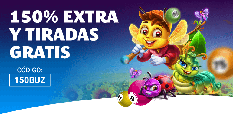 El usuario que realice un depósito de 10€ o más con el código 150BUZ recibirá un 150% extra en bono bingo hasta un máximo de 20€ y 10 Tiradas Gratis en la slot 3 Buzzing Wild.