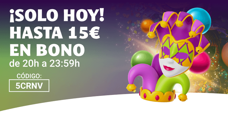 SÓLO HOY DE 20H A 23.59H: Haz un depósito de 15€ o más con el código 5CRNV y recibirás 5€ en bono bingo.