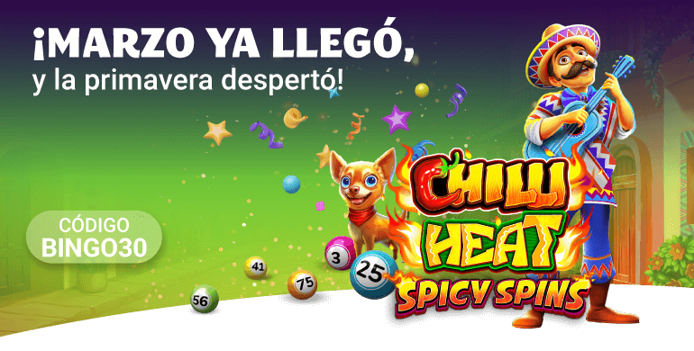 ¡Empieza el primer fin de semana de marzo! Deposita 25€ o más con el código BINGO30 en YoBingo y recibirás 7.5€ en Bono Bingo y 30 Tiradas Gratis en la slot Chilli Heat Spicy Spins.