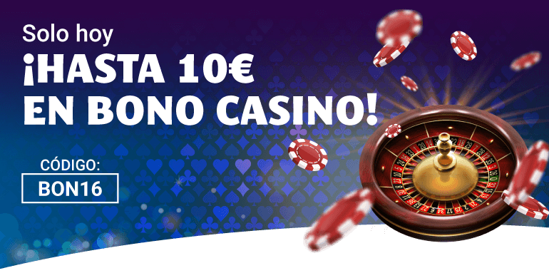 Si realizas un depósito de 15€ con el código BON16 recibirás 5€ de Bono Casino. Pero espera, ¡puedes utilizarlo dos veces y conseguir hasta 10€ de Bono Casino!