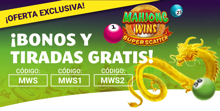 | MWS1 | 50€ | 10 Tiradas Gratis en Mahjong Wins Super Scatter y 20€ en Bono Bingo |