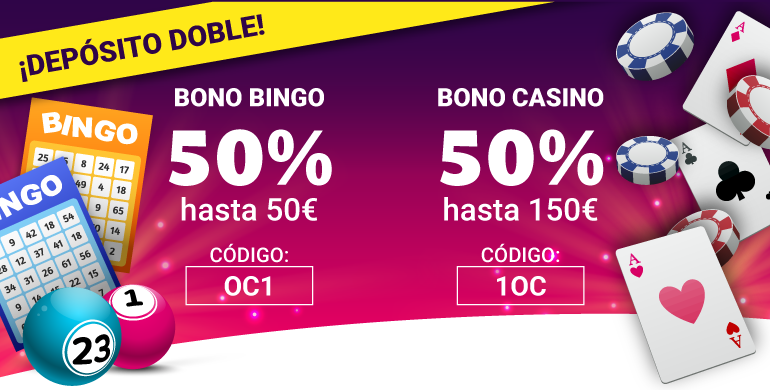 - El usuario que realice un depósito de 20€ o más con el código OC1 conseguirá un 50% extra hasta recibir un máximo de 50€ en Bono Bingo.