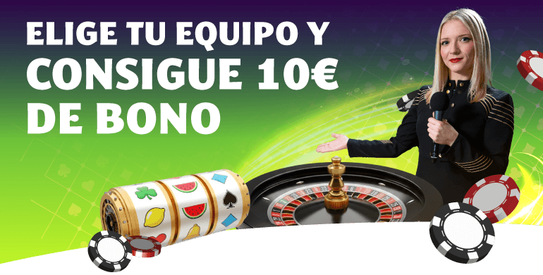 ¡Es hora de elegir! Elige entre Slots y Live Casino, únete a tu equipo favorito y después juega 30€ de dinero real en Slots o Live Casino y conseguirás 10€ en Bono Casino.