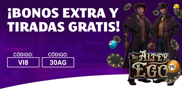 - El usuario que realice un depósito de 30€ o más con el código 30AG conseguirá un 50% extra hasta recibir un máximo de 30€ en Bono Casino y 10 Tiradas Gratis en la slot The Alter Ego.